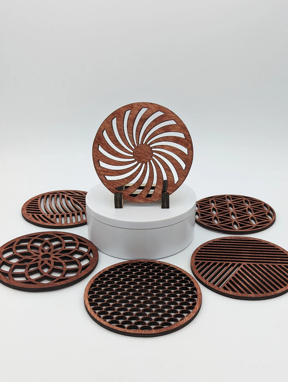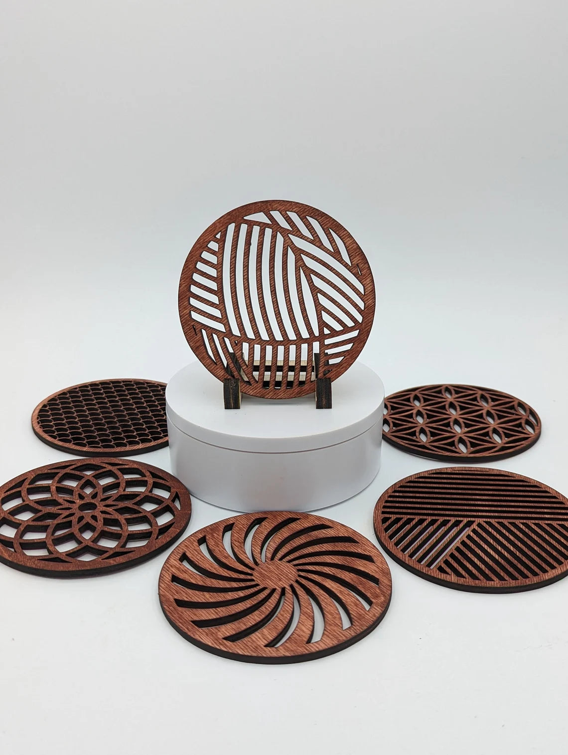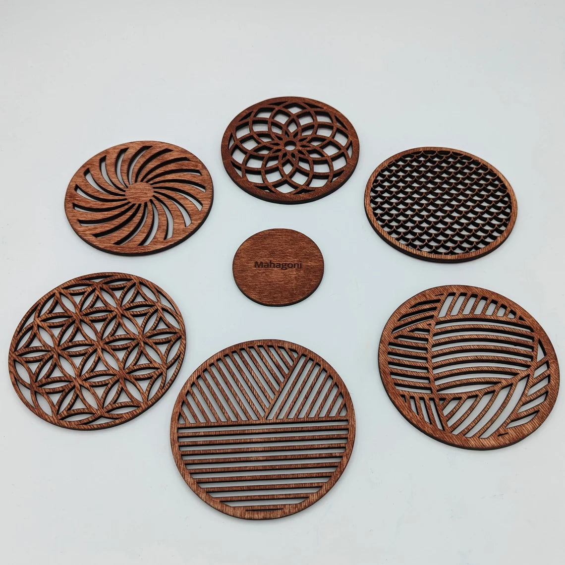 Dieses Set besteht aus sechs runden Untersetzern mit einem Durchmesser von 10 cm, die mit einem Lasercutter aus hochwertigem Birken-Holz geschnitten werden. Das Material ist nicht nur robust, sondern verleiht auch eine warme und natürliche Atmosphäre. Die filigranen Baumstämme auf dem Ständer sind einzigartig und geben dem Set eine rustikale Note. Das Design wird garantiert in Ihrem Zuhause zum Hingucker werden.