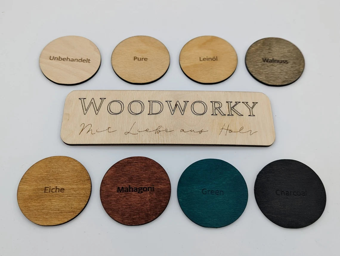 Als handgefertigtes Produkt legen wir besonderen Wert auf die Qualität und die Liebe zum Detail. Unser Set ist sorgfältig von Hand gefertigt und jede Holzscheibe ist einzigartig. Sie werden keine zwei identischen Untersetzer finden, was unser Set zu einem Unikat macht.