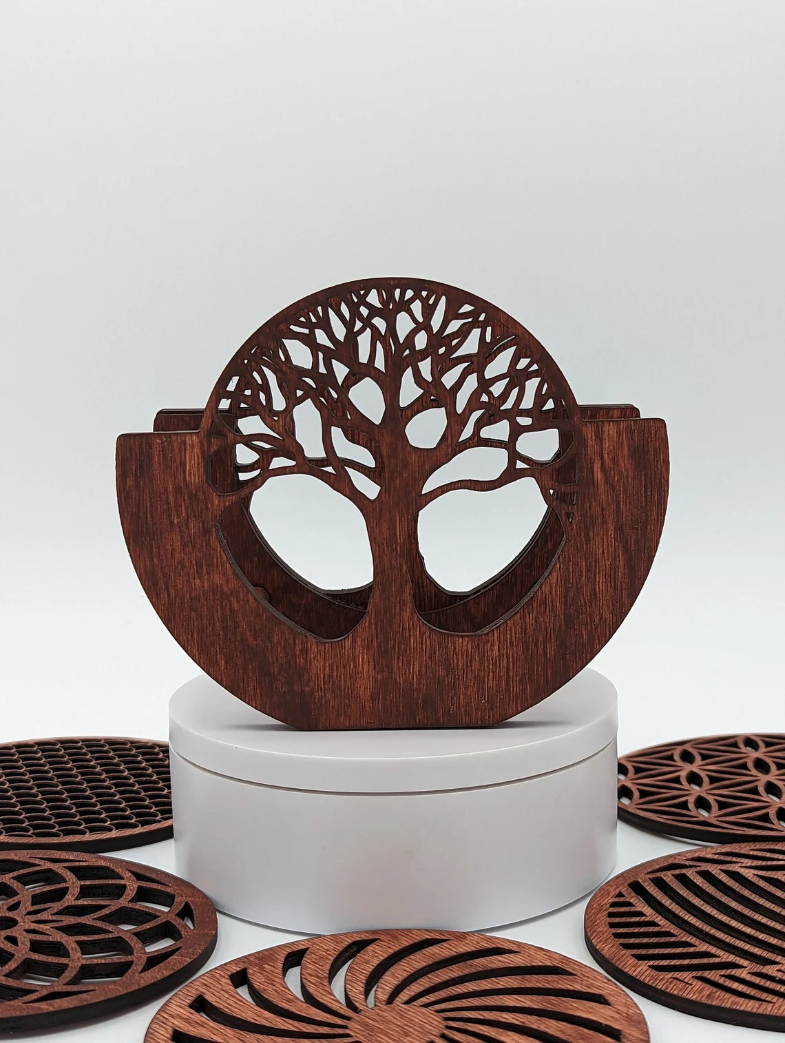 Ein exquisites Getränkeuntersetzer Set aus Holz ist eine der besten Möglichkeiten, um Ihren Wohnbereich zu dekorieren und zugleich Ihre Möbel vor Flecken und Kratzern zu schützen. Wenn Sie nach einem Set suchen, das perfekt zu Ihrer Einrichtung passt, dann ist unser handgefertigtes Set mit Mahagoni Look und einem Ständer mit filigranem Baumstamm Design genau das Richtige für Sie.