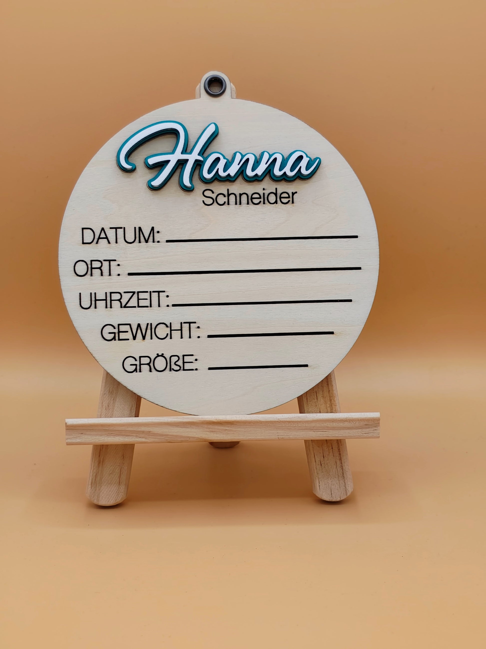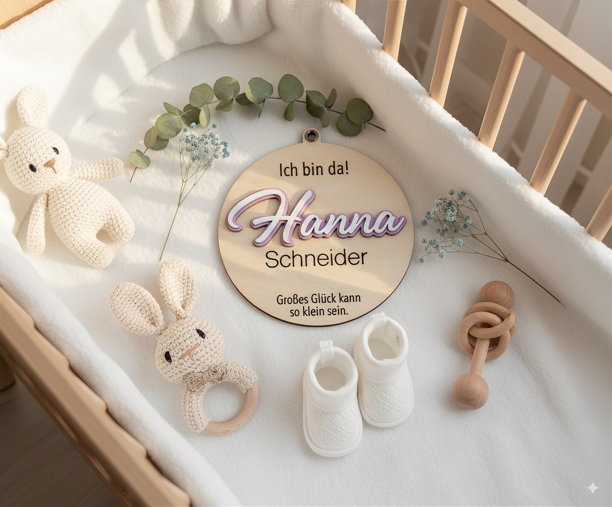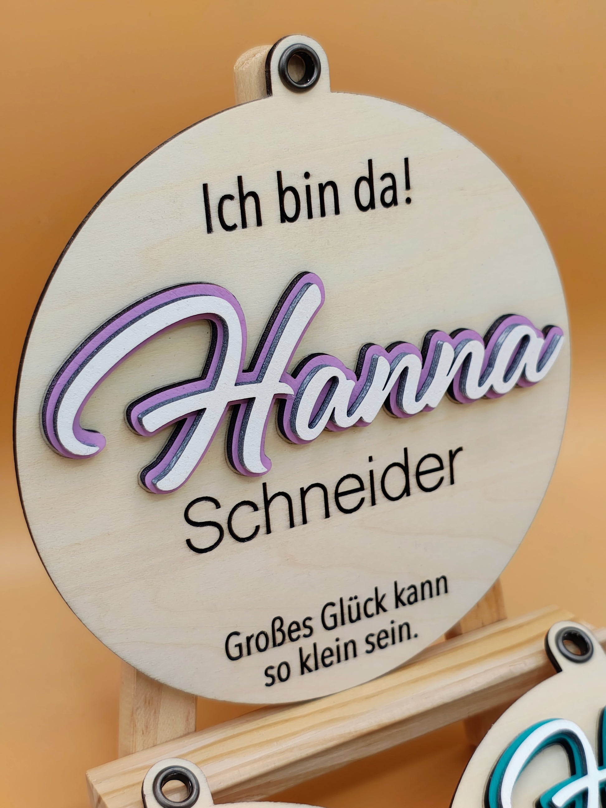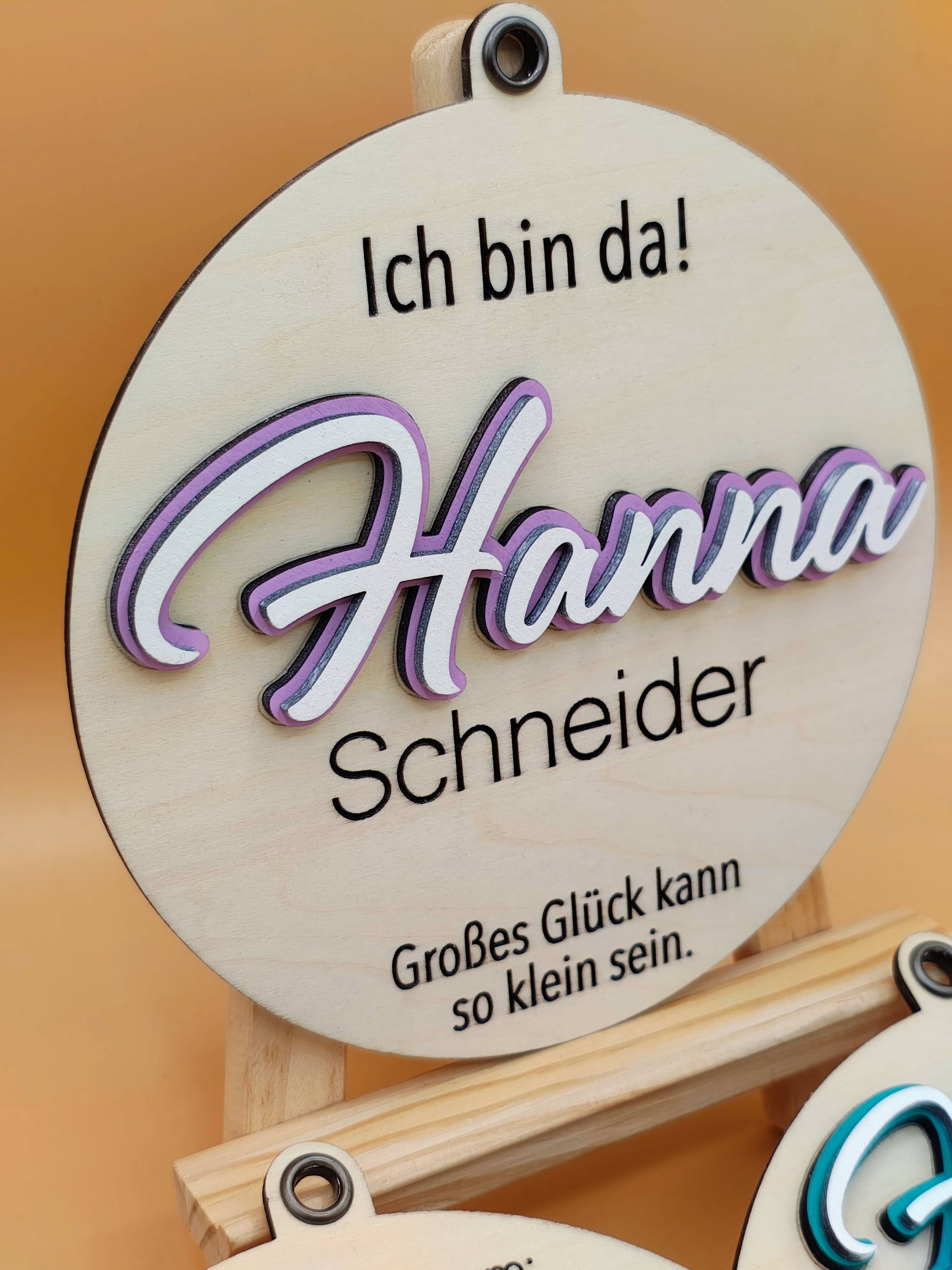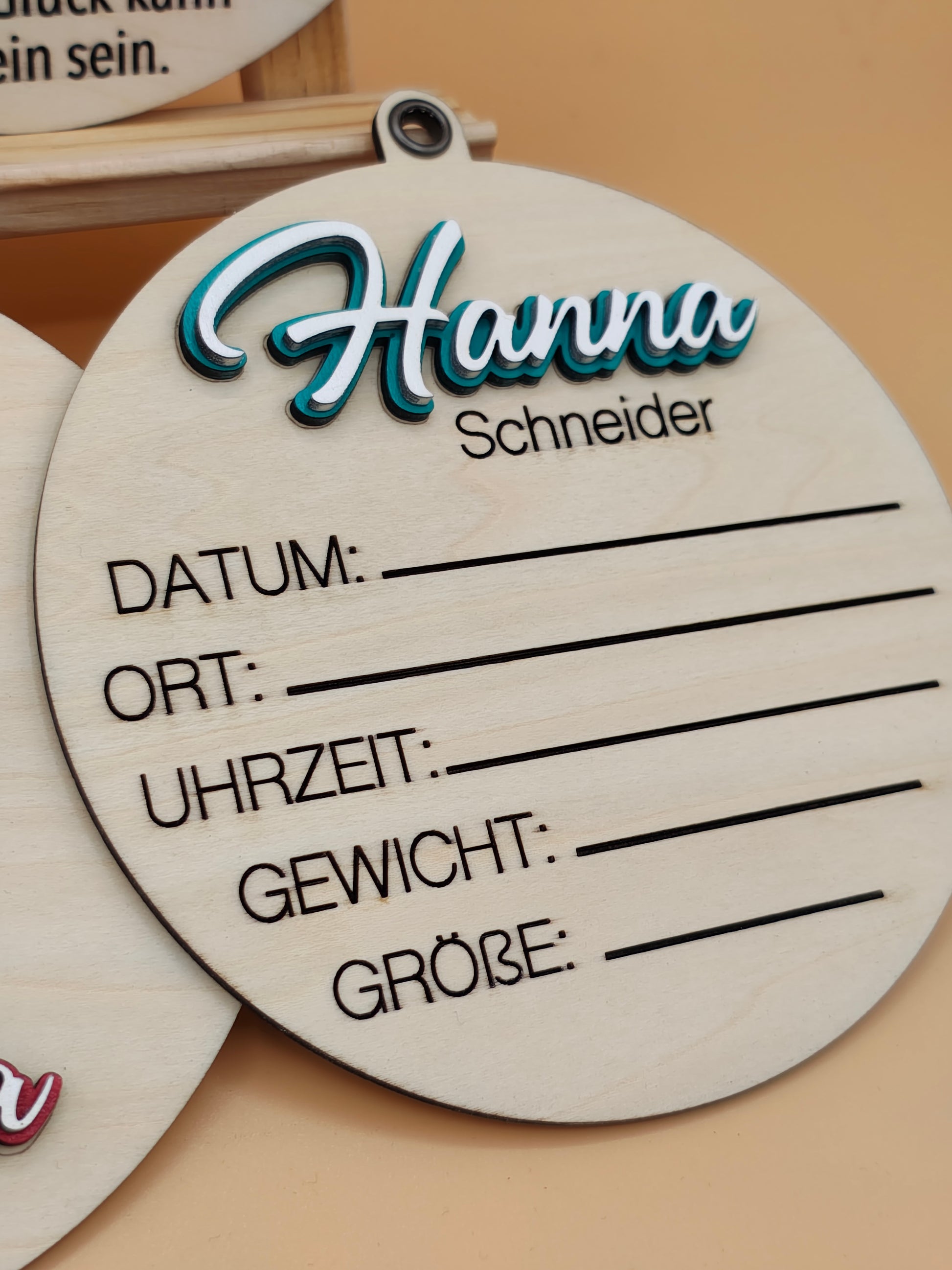 Ein besonderer Hingucker: Die Namen des Babys werden als feine 3D-Schriftzüge in filigraner Optik auf das Holz aufgebracht – wählbar aus 15 verschiedenen Wunschfarben. Die hochwertige Umsetzung verleiht jedem Schild eine einzigartige, lebendige Wirkung. Dank integrierter Öse lassen sich die Schilder ganz einfach aufhängen – perfekt für die Wand im Kinderzimmer oder als Deko beim Fotoshooting.