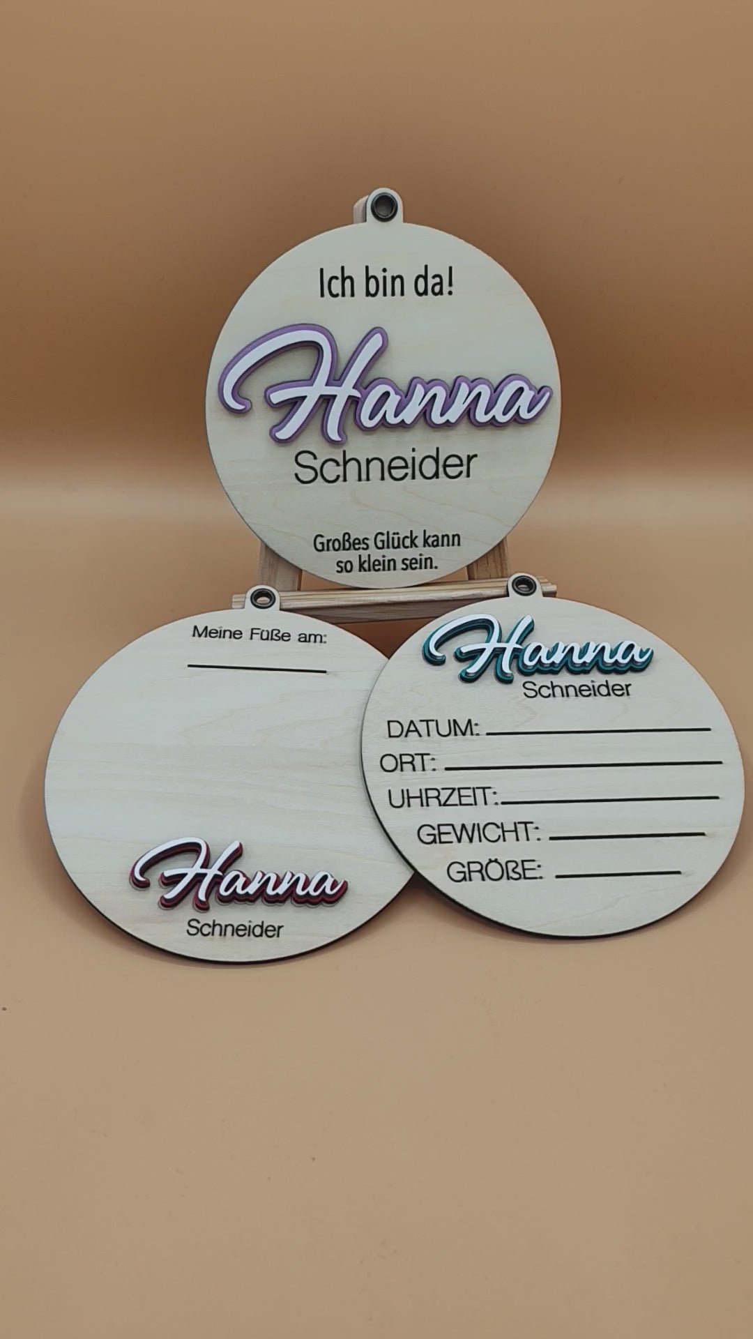 Dieses Set aus drei liebevoll gestalteten Holzschildern ist eine besondere Erinnerung an die Geburt eures Kindes. Jedes Schild ist individuell gestaltbar – ideal als Geschenk oder zur Dekoration im Babyzimmer.