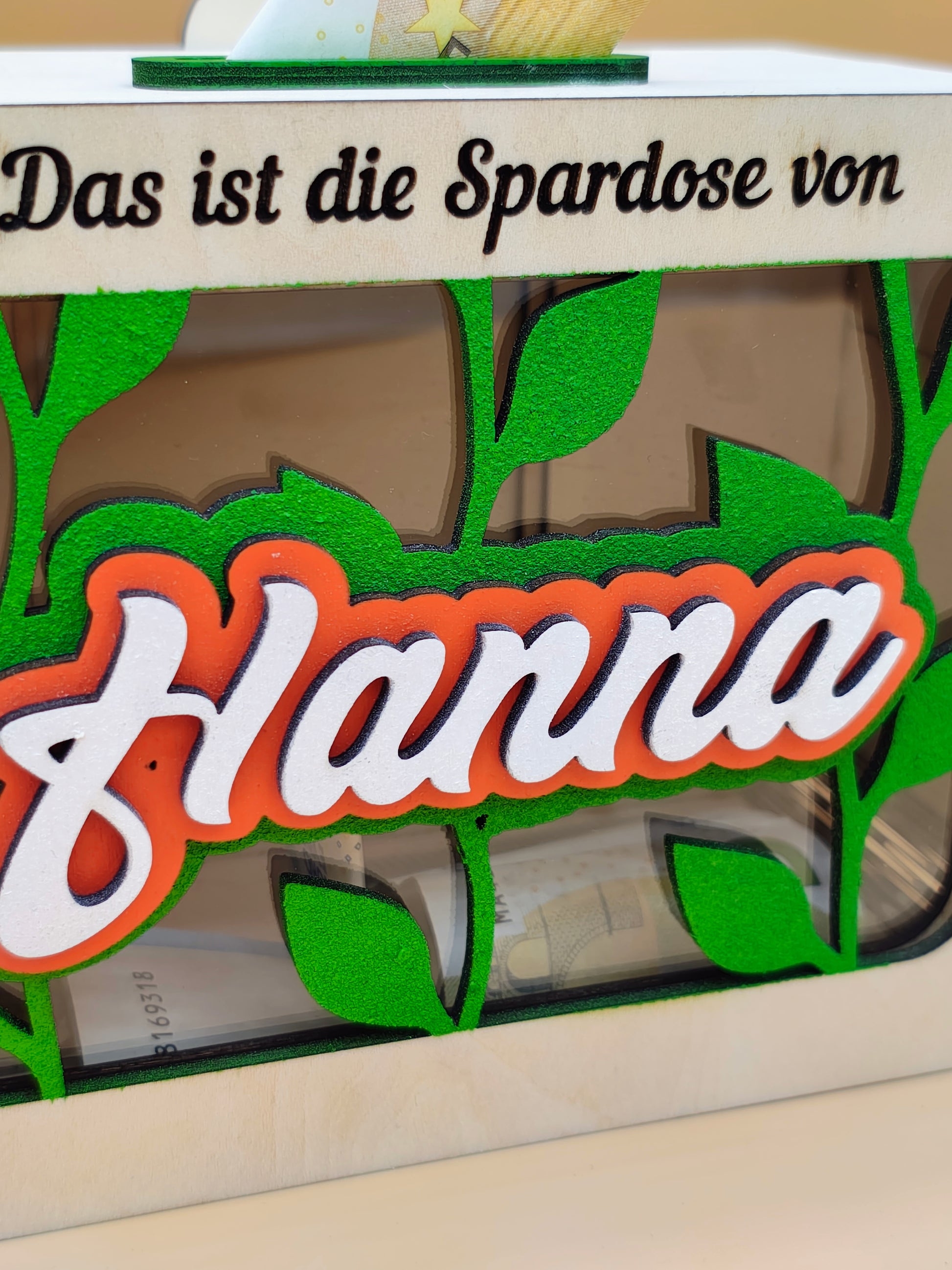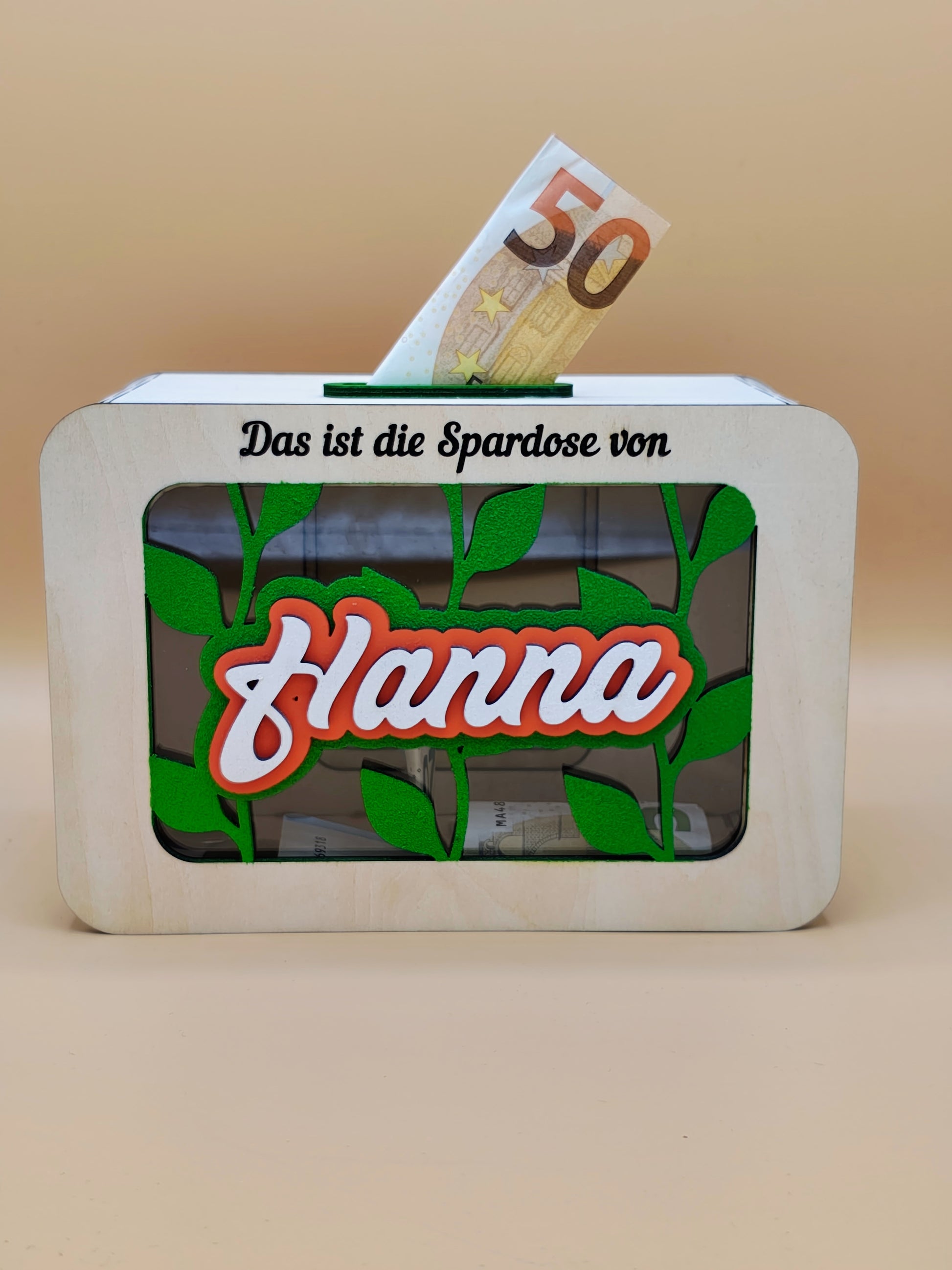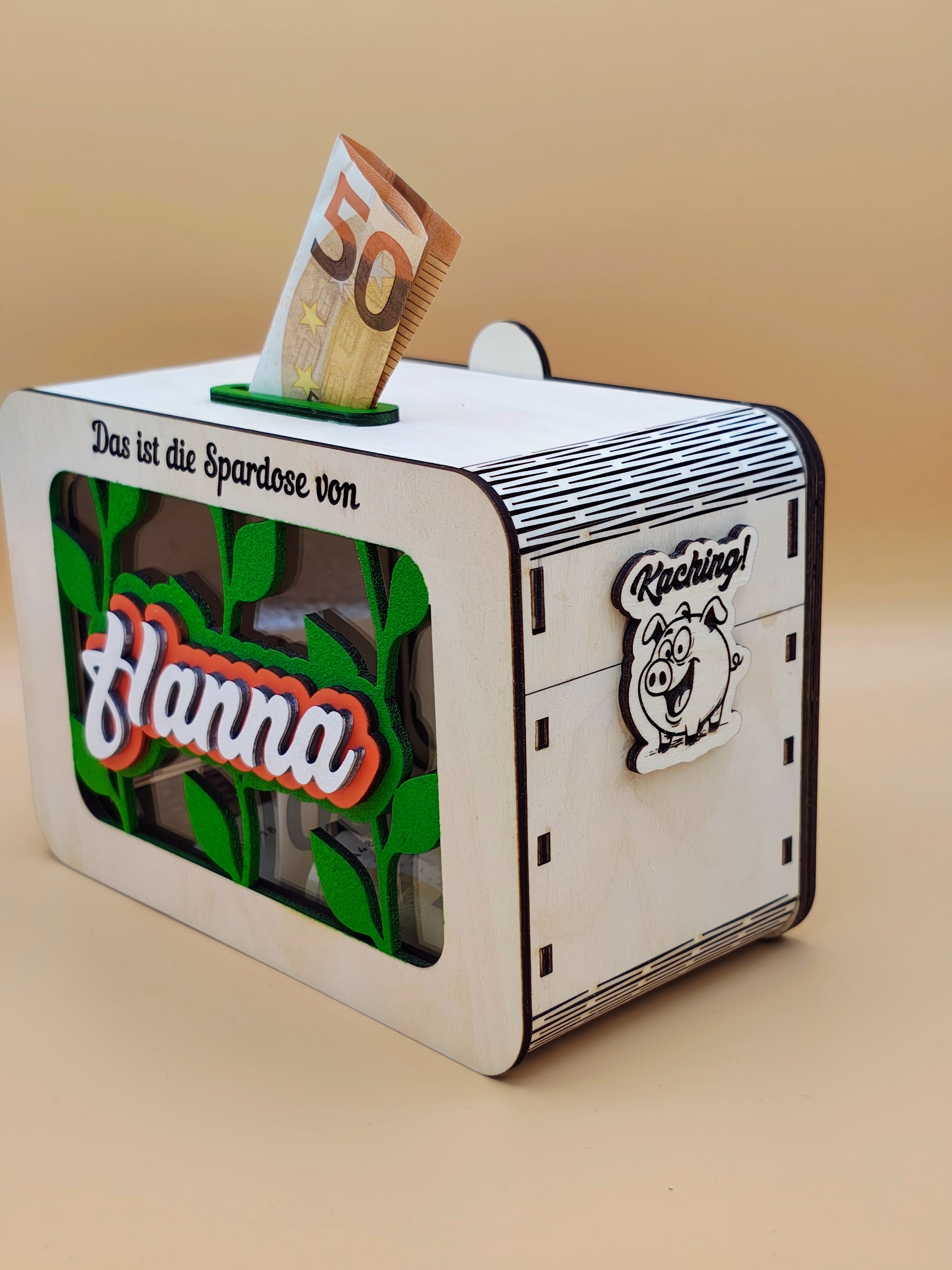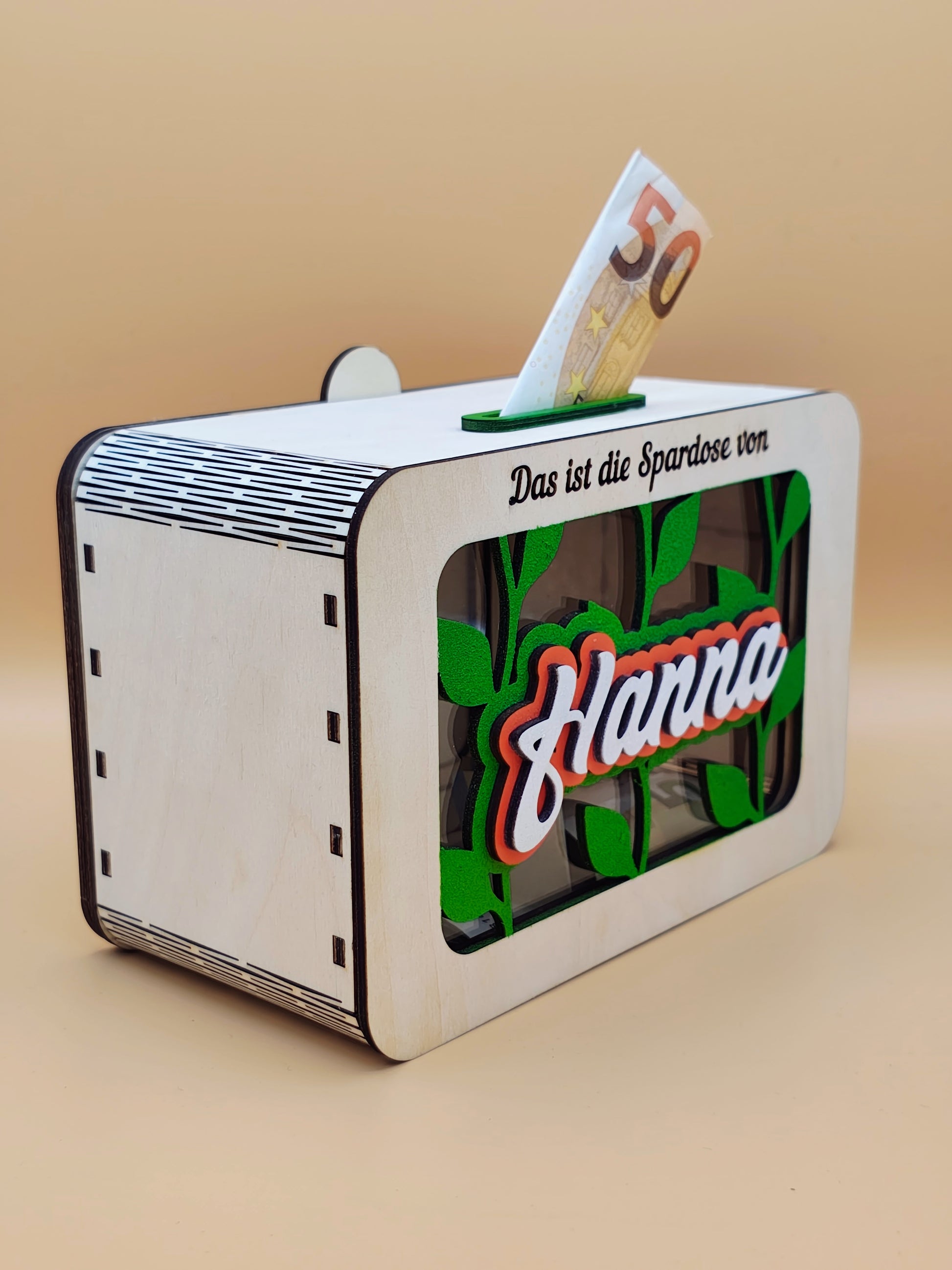 Das wunderschöne Design mit Sichtfenster macht das Sparen motivierend und spannend! Der Name des Kindes wird in einem einzigartigen Schriftzug aus mehreren Lagen Birkenholz vor dem Sichtfenster in strahlenden Farben präsentiert. Durch die individuelle Personalisierung mit dem Namen des Kindes und niedlichen Wunschmotiven wird jede Sparbüchse zu einem ganz besonderen Unikat – perfekt als Geschenk zum Geburtstag, zu Weihnachten oder zum Schulstart.